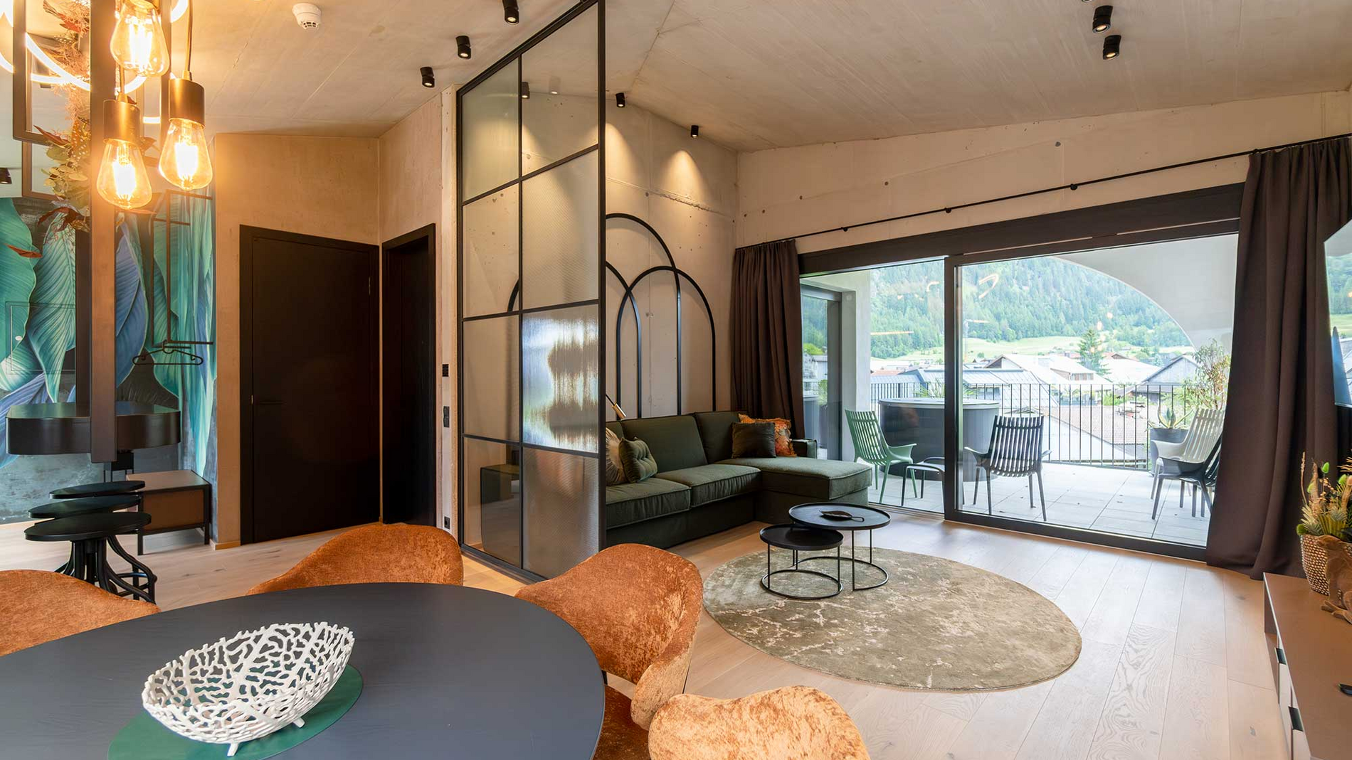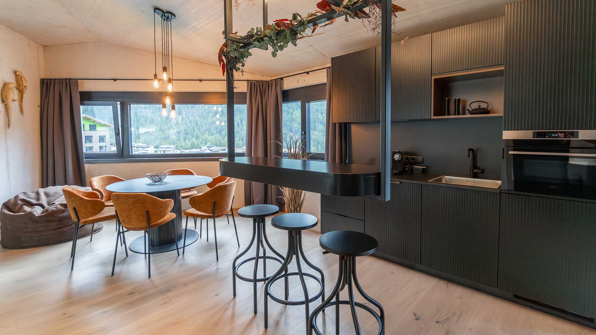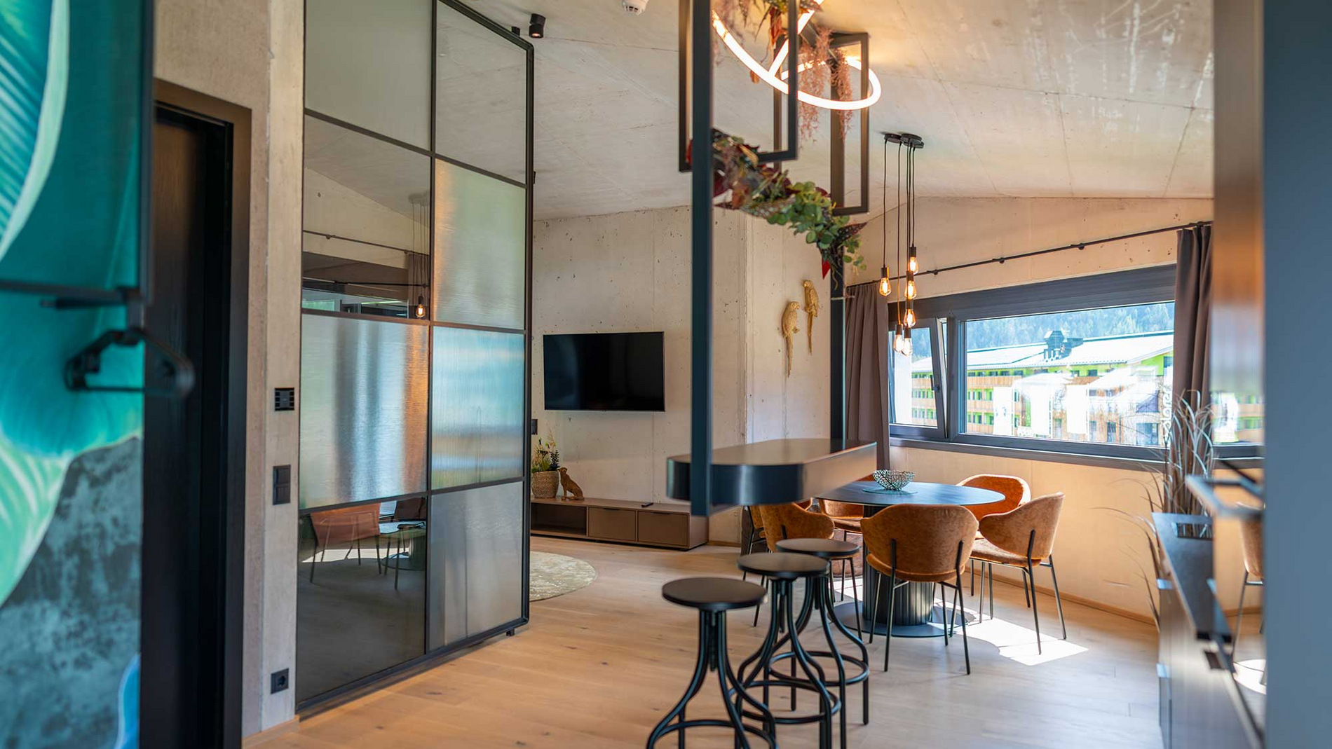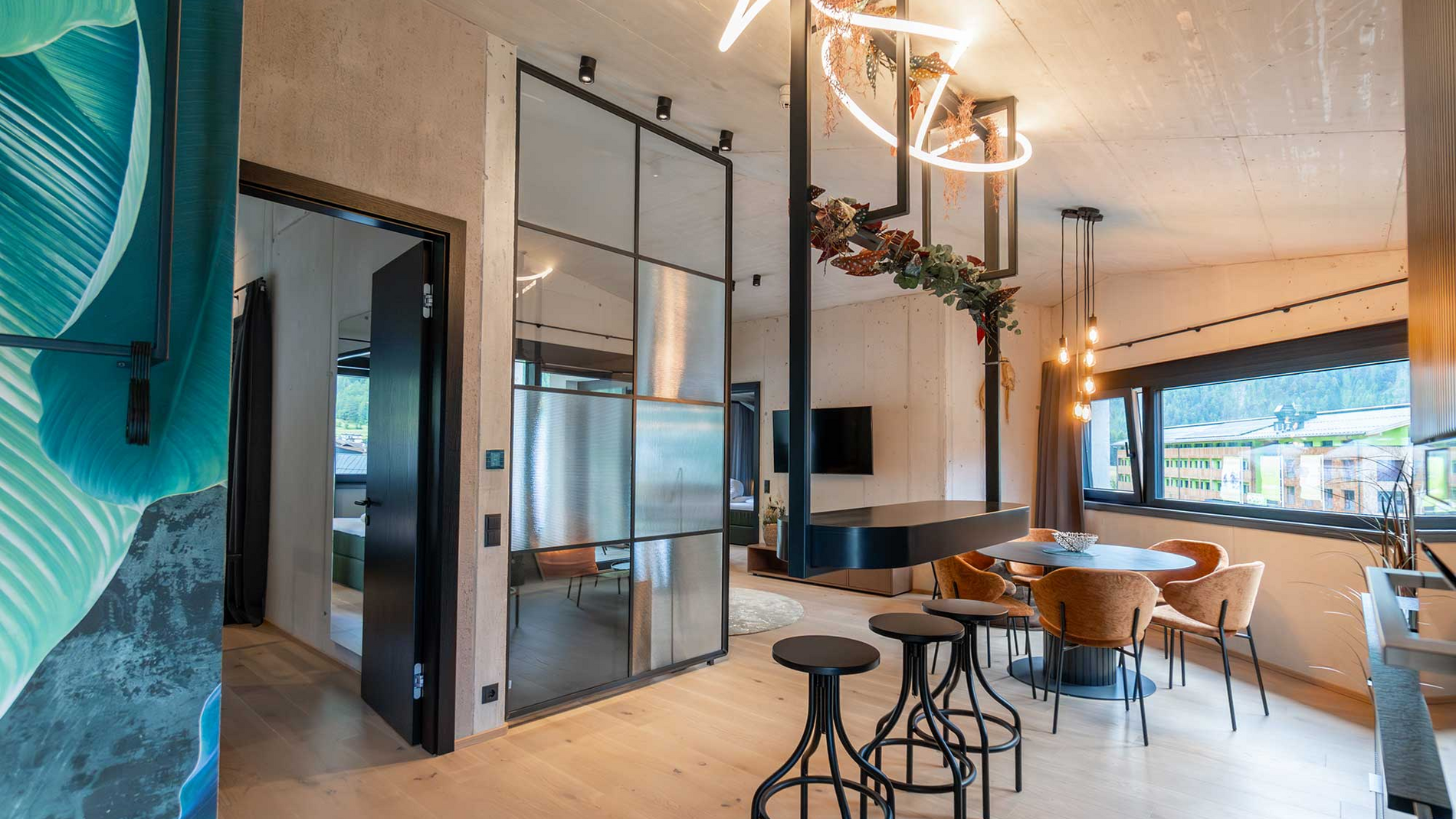 Ganz oben im 4. Stock erwartet dich unser exklusives Penthouse mit zwei Schlafzimmern, zwei Bädern und einer großzügigen Dachterrasse. Das absolute Highlight: dein privater Hot Pot mit atemberaubendem Blick auf die Dreitausender. Für bis zu sechs Personen – Luxus und Freiheit ohne Kompromisse.