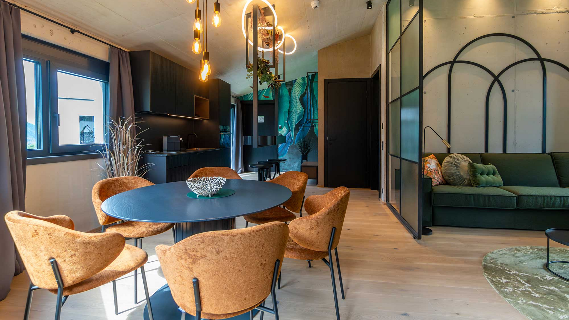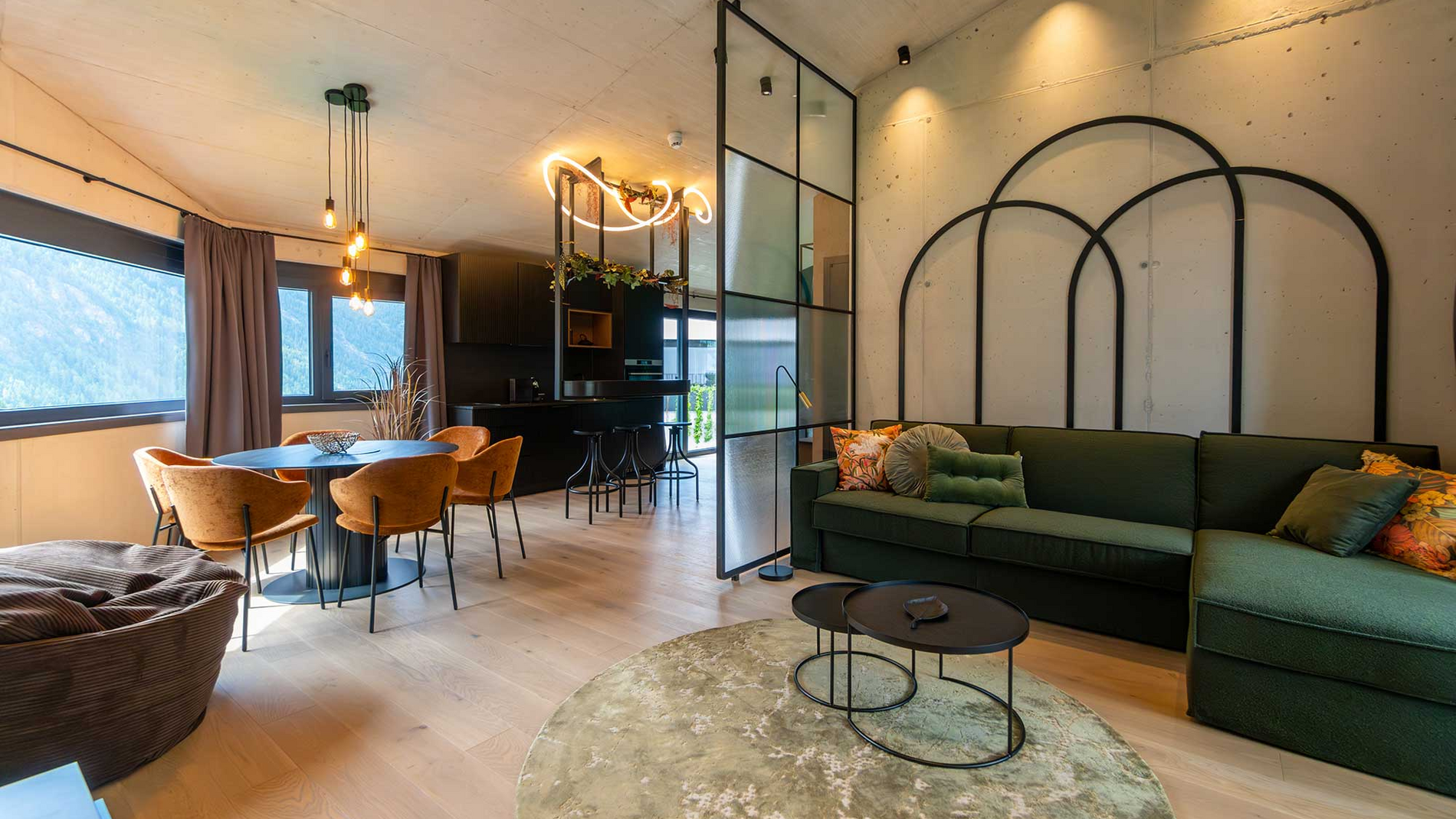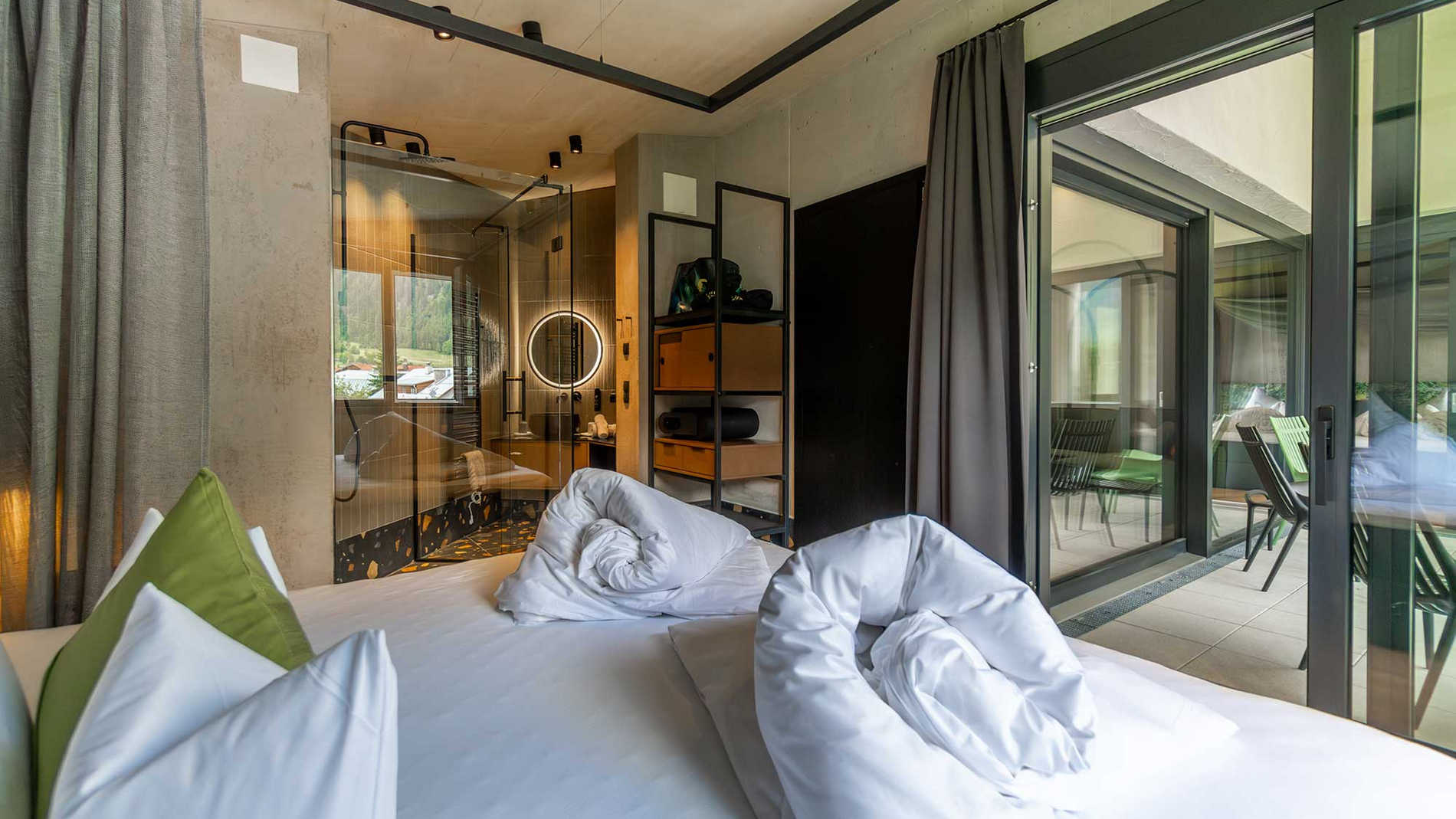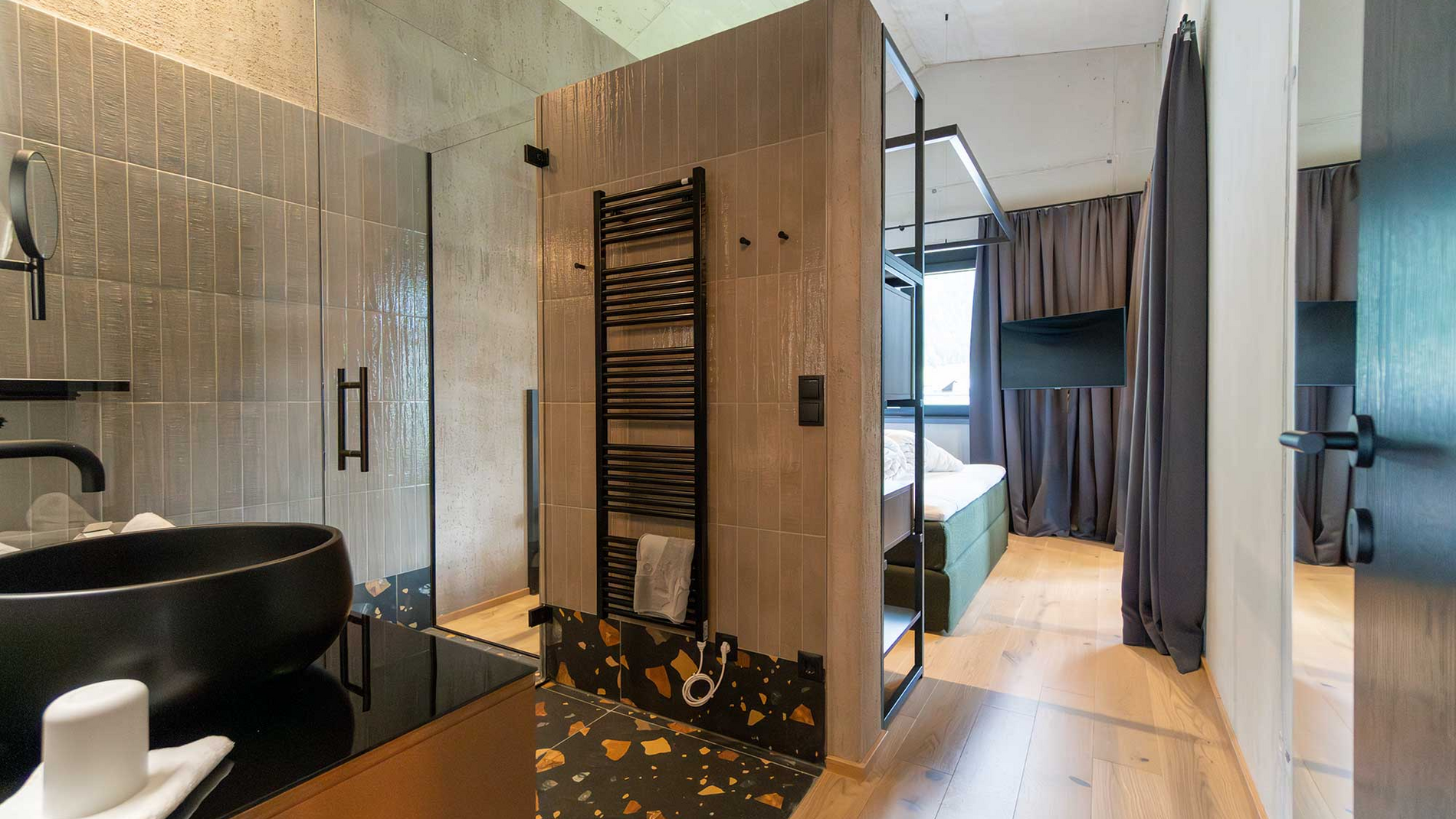 Ganz oben im 4. Stock erwartet dich unser exklusives Penthouse mit zwei Schlafzimmern, zwei Bädern und einer großzügigen Dachterrasse. Das absolute Highlight: dein privater Hot Pot mit atemberaubendem Blick auf die Dreitausender. Für bis zu sechs Personen – Luxus und Freiheit ohne Kompromisse.