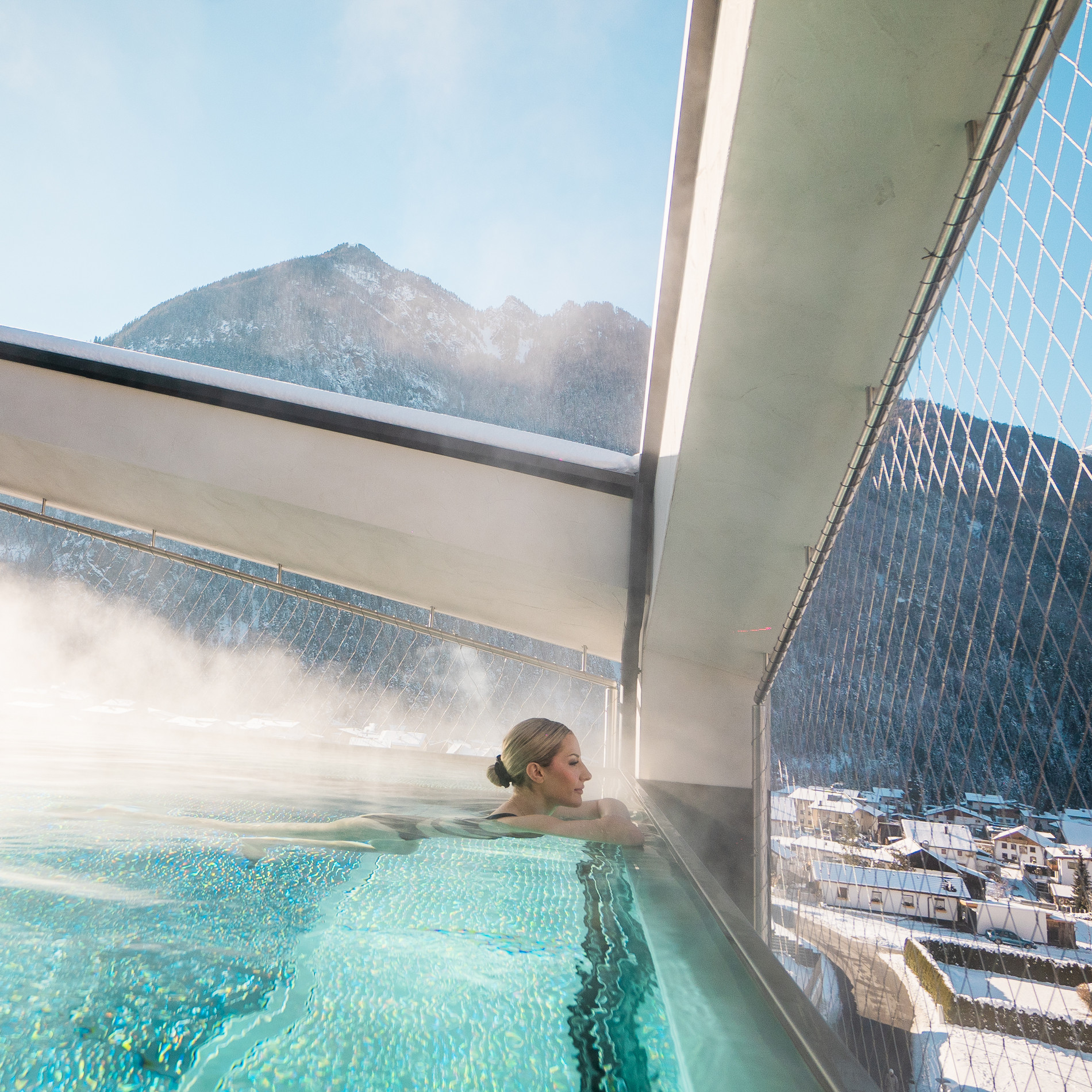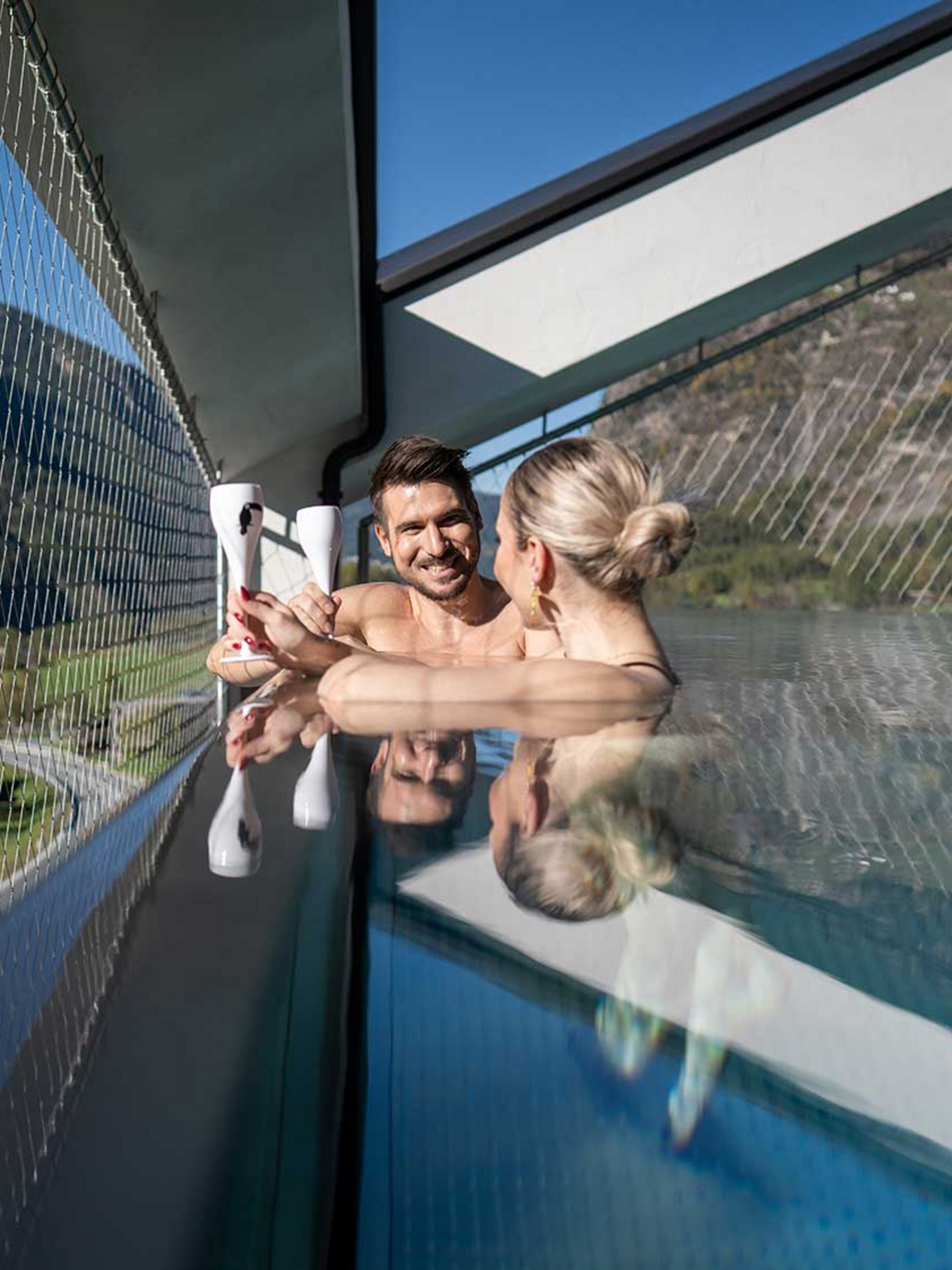Der gläserne Pool ist ein stilles Highlight – ein Ort, an dem du dich schwerelos fühlst und die Gedanken mit dem Blick auf die Berge davontreiben lässt.